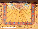 Vertical declinant de tarda, línies horàries fletxades, números romans (de VI a VI), gnòmon (40 cms.) recolzat, lema, elevació 232 mts.