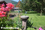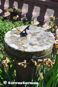 :: DESCRIPCIÓ: Horitzontal circular, línies horàries i números romans (de V a VI), una mica desgastat i brut de líquens, gnòmon (15 cms.) triangular de forja, elevació 225 mts.