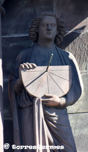 :: DESCRIPCIÓ: Canònic semicircular, sis sectors iguals, sostingut per la figura de l'adolescent, línies horàries, sense numeració, gnòmon (15 cms.) vareta, elevació 147 mts.