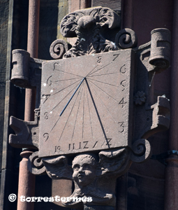 :: DESCRIPCIÓ: Vertical quadrat declinant a ponent, línies horàries, números àrabs (de 5 a 8), gnòmon (15 cms.) vareta, elevació 147 mts.