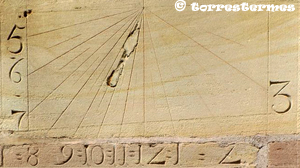 :: DESCRIPCIÓ: Vertical declinant de matí, gravat a la pedra del mur, línies horàries, números àrabs (de 5 a 3) en marc, gnòmon absent, elevació 147 mts.