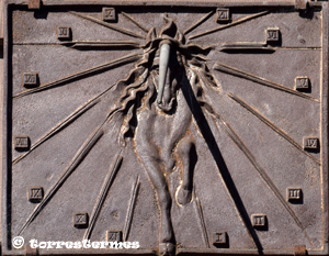 :: DESCRIPCIÓ: Vertical, podria ser de sèrie, calculat meridional, la paret declina molt a llevant, línies horàries, números romans (de V a VIII), gnòmon (15 cms.) vareta, surt del cap d'un unicorn que és la decoració central, elevació 141 mts.