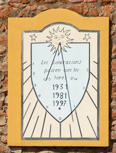 :: DESCRIPCIÓ: Forma un escut blau a l'interior, amb un sol al pol. Línies horàries a les hores i les mitges hores, de les 7:30 a les 3,30. No té xifres. J.Cirbian és l’autor de l’ultima restauració