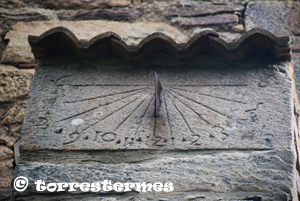 :: DESCRIPCIÓ: Vertical rectangular meridional, línies horàries i punts a les mitges hores, numeració aràbiga (de 6 a 6), gnòmon (15 cms.) triangular, elevació 1178 mts.