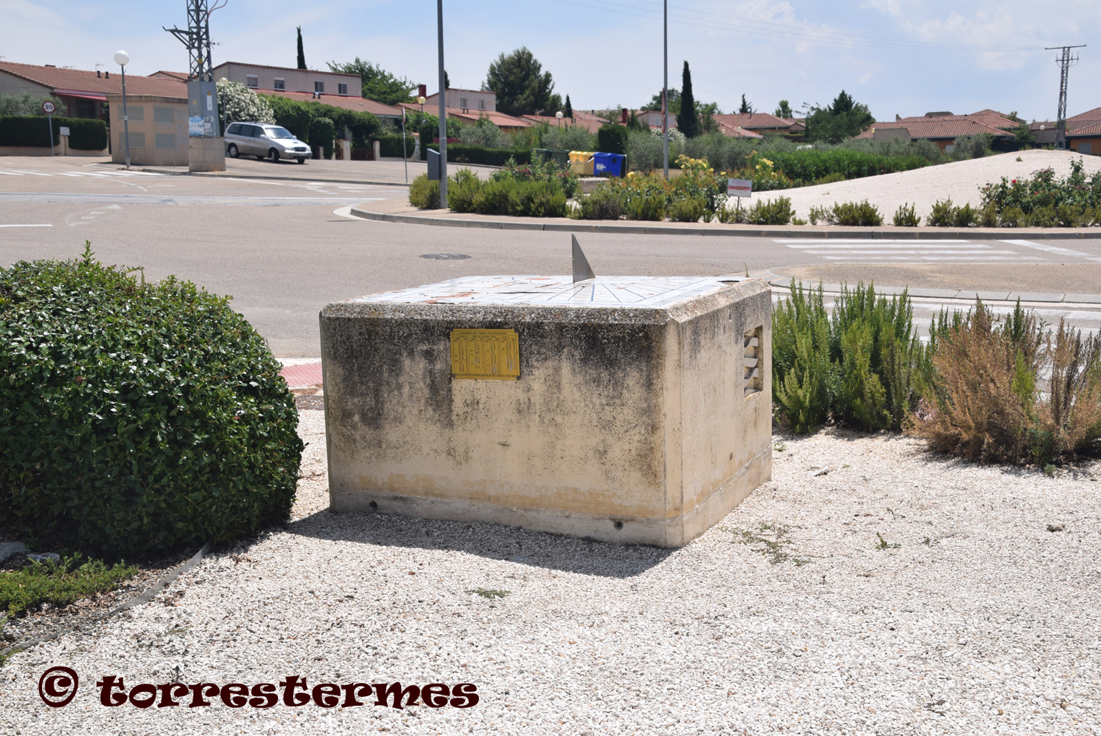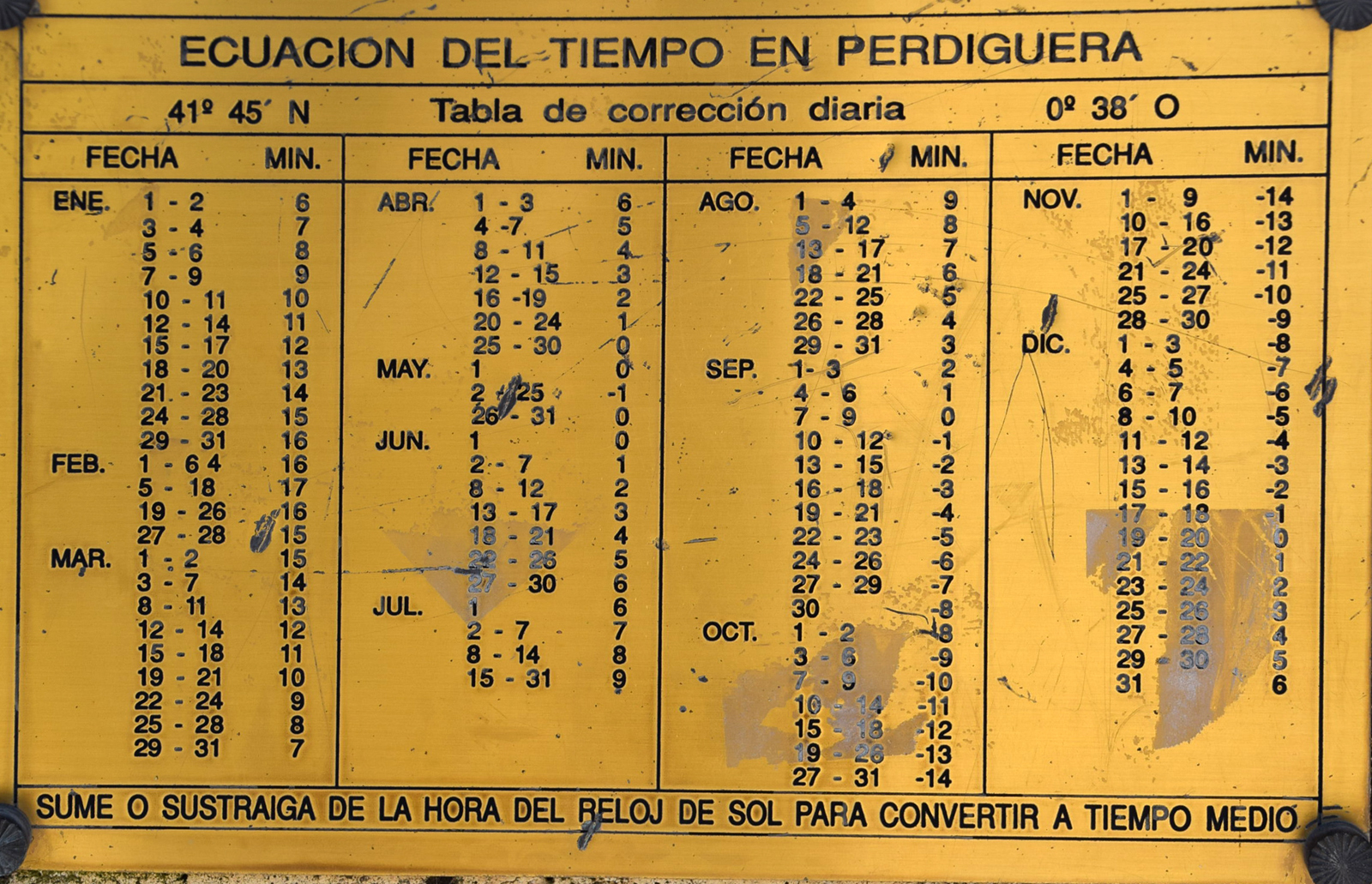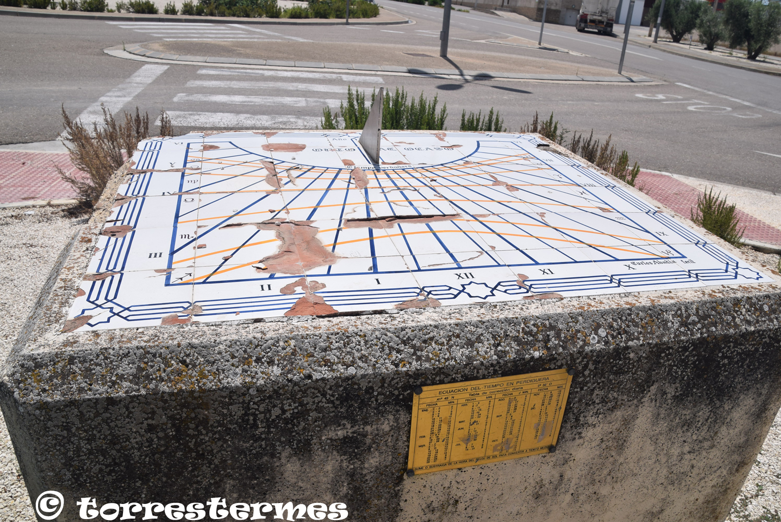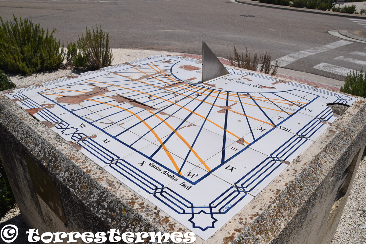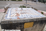 :: DESCRIPCIÓ: Composició de rajoles de ceràmica (7x6) horitzontal, línies horàries i mitges hores, línies i signes zodiacals, números romans (de VI a VI) en marc, gnòmon (30 cms.) triangular, signat i datat, elevació 466 mts.