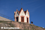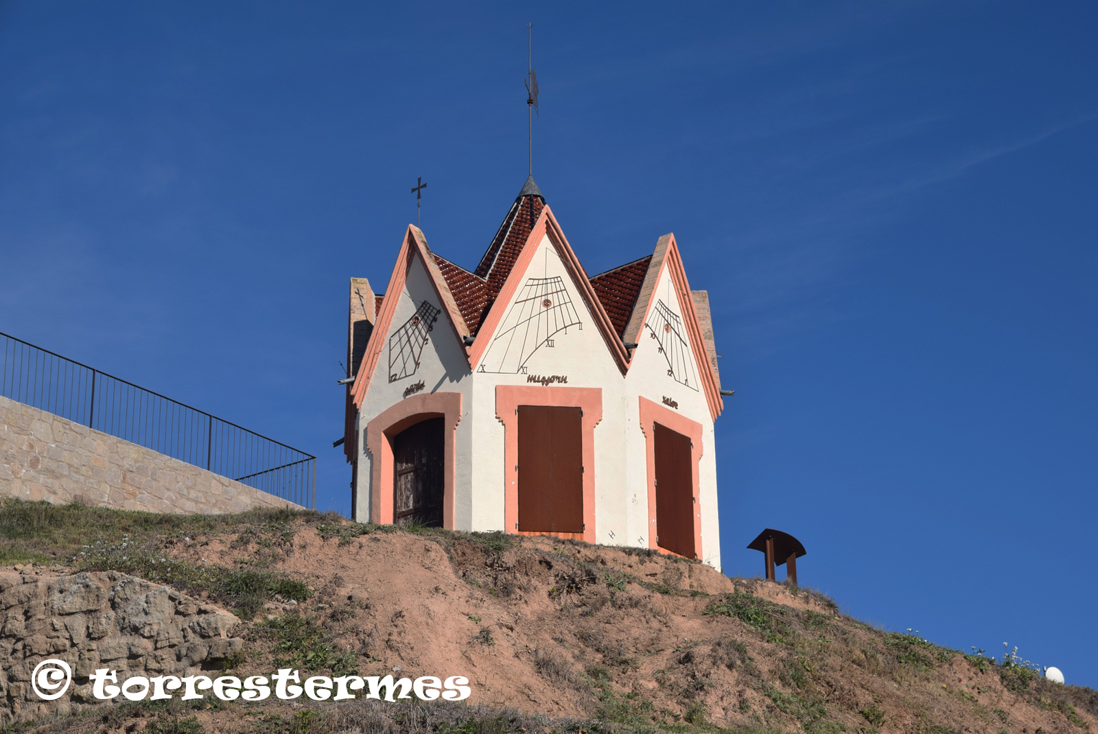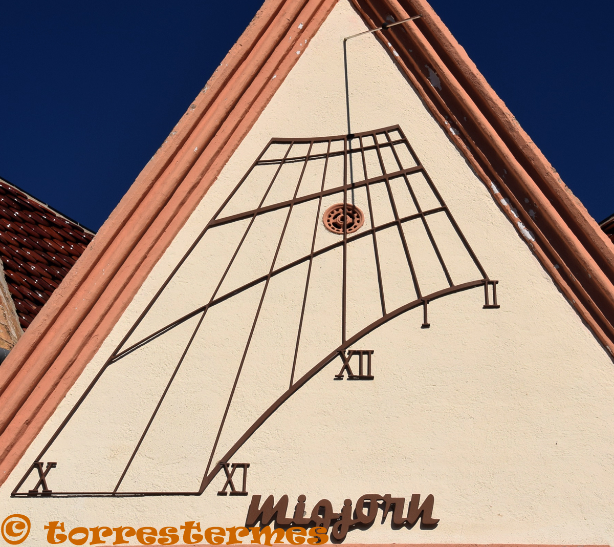 :: DESCRIPCIÓ: Vertical orientat a ponent, ferros perfilats enganxats a la paret, línies horàries i mitges hores, números romans (de X a II), gnòmon (40 cms.) paral·lel, elevació 635 mts.