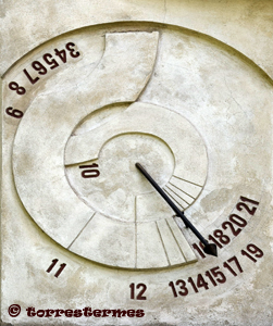:: DESCRIPCIÓ: Vertical circular, declinant a ponent, inclinat sobre el pla de la paret, línies horàries, curiosa numeració aràbiga (de 3 a 21), gnòmon (50 cms.) fletxat, elevació 104 mts. snm.