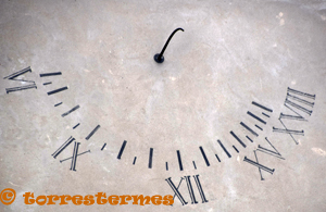 :: DESCRIPCIÓ: Vertical semicircular declinant a llevant, pintat sobre un triangle que fa la teulada de l'edifici a dues aigües, línies horàries curtes i marques a les mitges hores, números romans (VI, IX, XII, XV, XVIII), gnòmon (30 cms.) vareta, elevació 120 mts. snm.