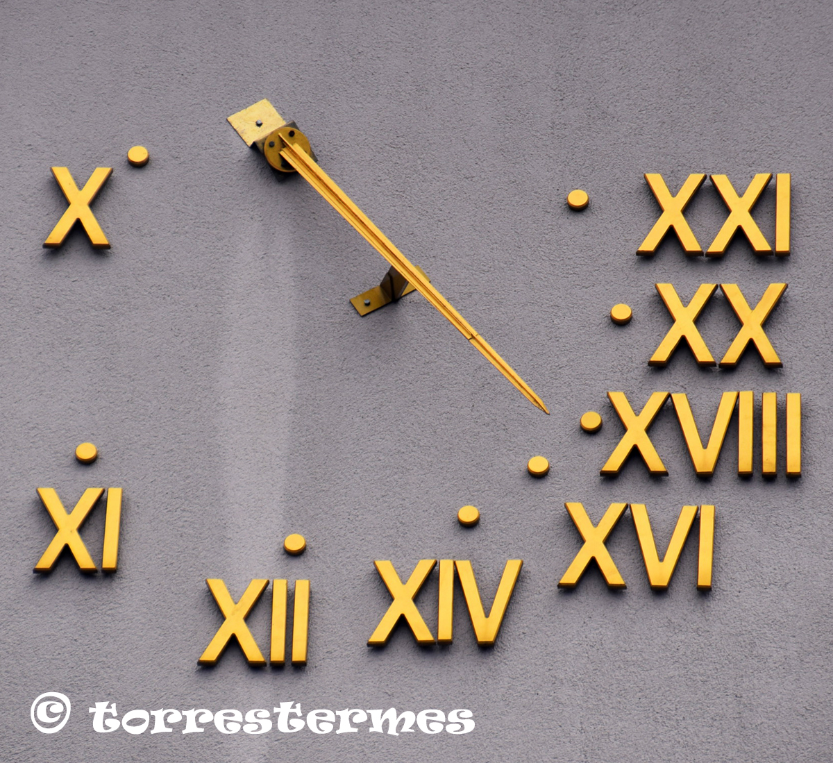 :: DESCRIPCIÓ: Vertical, orientat a ponent, peces metàl·liques enganxades a la façana de l'edifici, punts a les hores, números romans (de X a XXI), gnòmon (50 cms.) vareta amb suport, elevació 125 mts. snm.