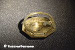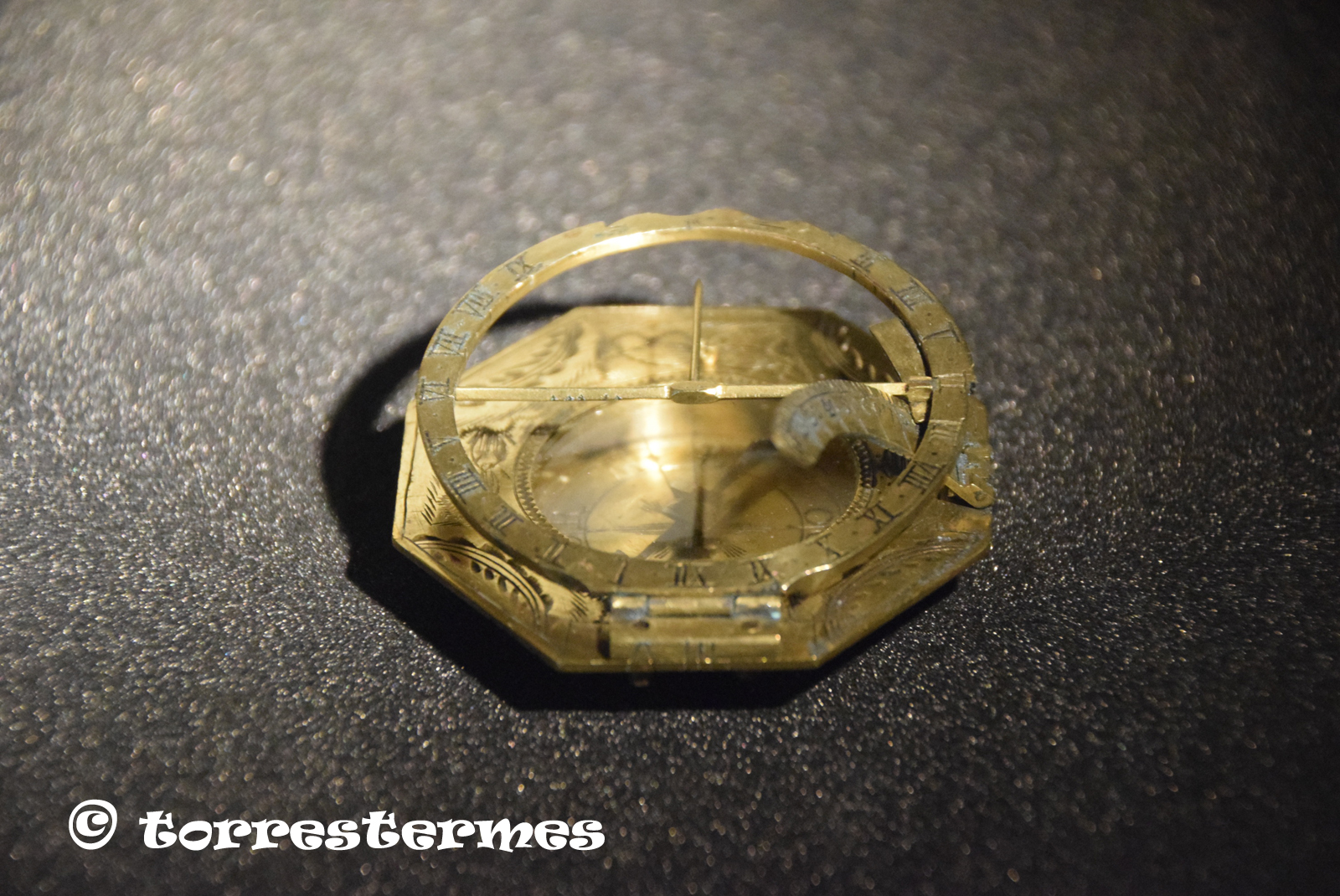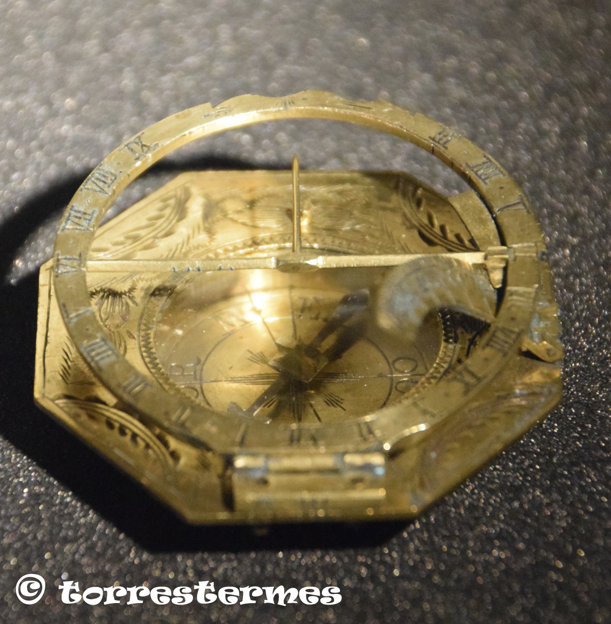 :: DESCRIPCIÓ: Rellotge solar horitzontal de butxaca, am brúixola, cercle d'inclinació del gnòmon, números romans (de IX a III)