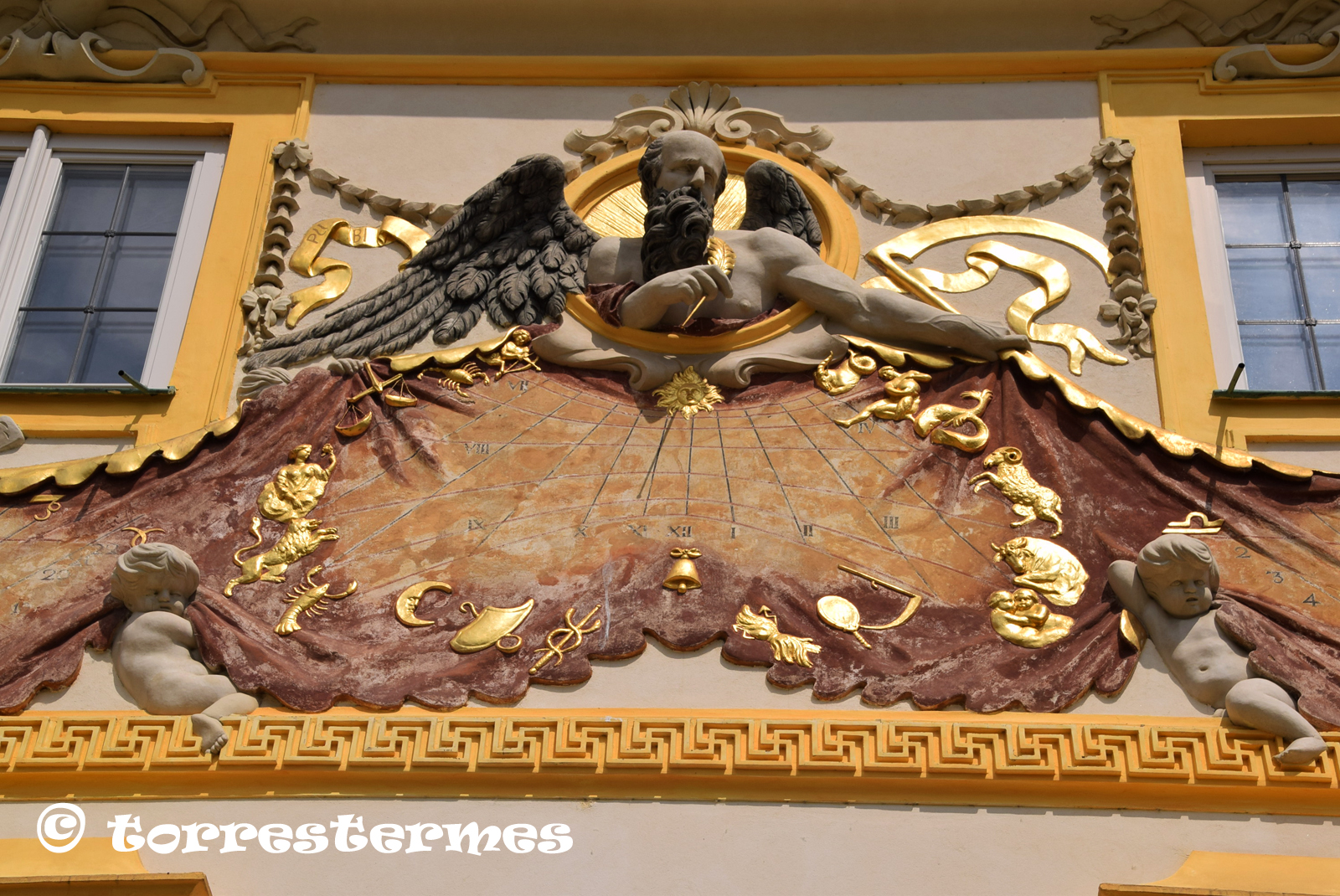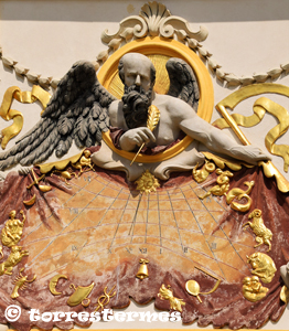 :: DESCRIPCIÓ: Composició de tres rellotges verticals, conjunt sota la figura de Chronos, el rellotge del mig d'hores locals, línies horàries, línies i signes zodiacals, números romans (de VI a IV) , gnòmon (30 cms.) vareta, elevació 98 mts. snm.