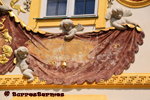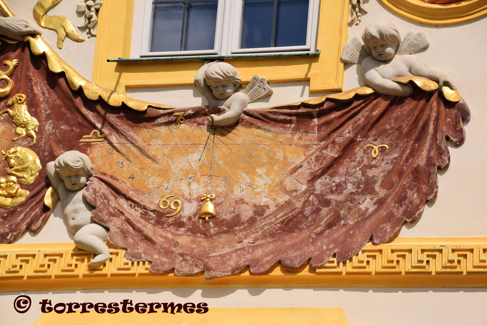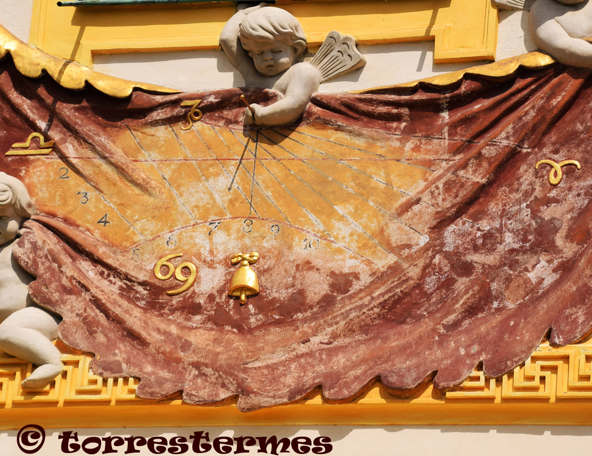 :: DESCRIPCIÓ: Composició de tres rellotges verticals, conjunt sota la figura de Chronos, el rellotge de la dreta d'hores itàliques, línies horàries, solsticis i equinoccis, números àrabs (de 2 a 10) , gnòmon (15 cms.) vareta horitzontal, elevació 98 mts. snm.