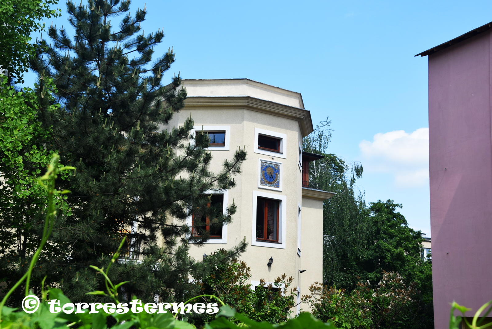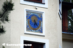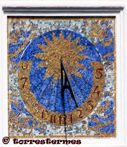 :: DESCRIPCIÓ: Vertical circular dins marc quadrat, declinant a llevant, fet de tessel·les ceràmiques, línies horàries, numeració aràbiga (de 6 a 5) en corona, gnòmon (40 cms.) recolzat, elevació 99 mts. snm.