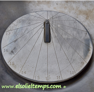 :: DESCRIPCIÓ: Font publica, cilindre que recull l’aigua i dins hi ha un quadrant horitzontal de 23 cm de diàmetre. Gnòmon triangular del extrem surt el rajolí d’aigua que marca l’hora, números àrabs. Elevació 1049 mts. snm.