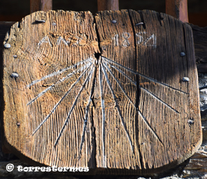 :: DESCRIPCIÓ: Vertical quadrat de fusta, orientat a llevant, línies horàries, sense numeració, gnòmon absent, datat, elevació 1561 mts. snm.