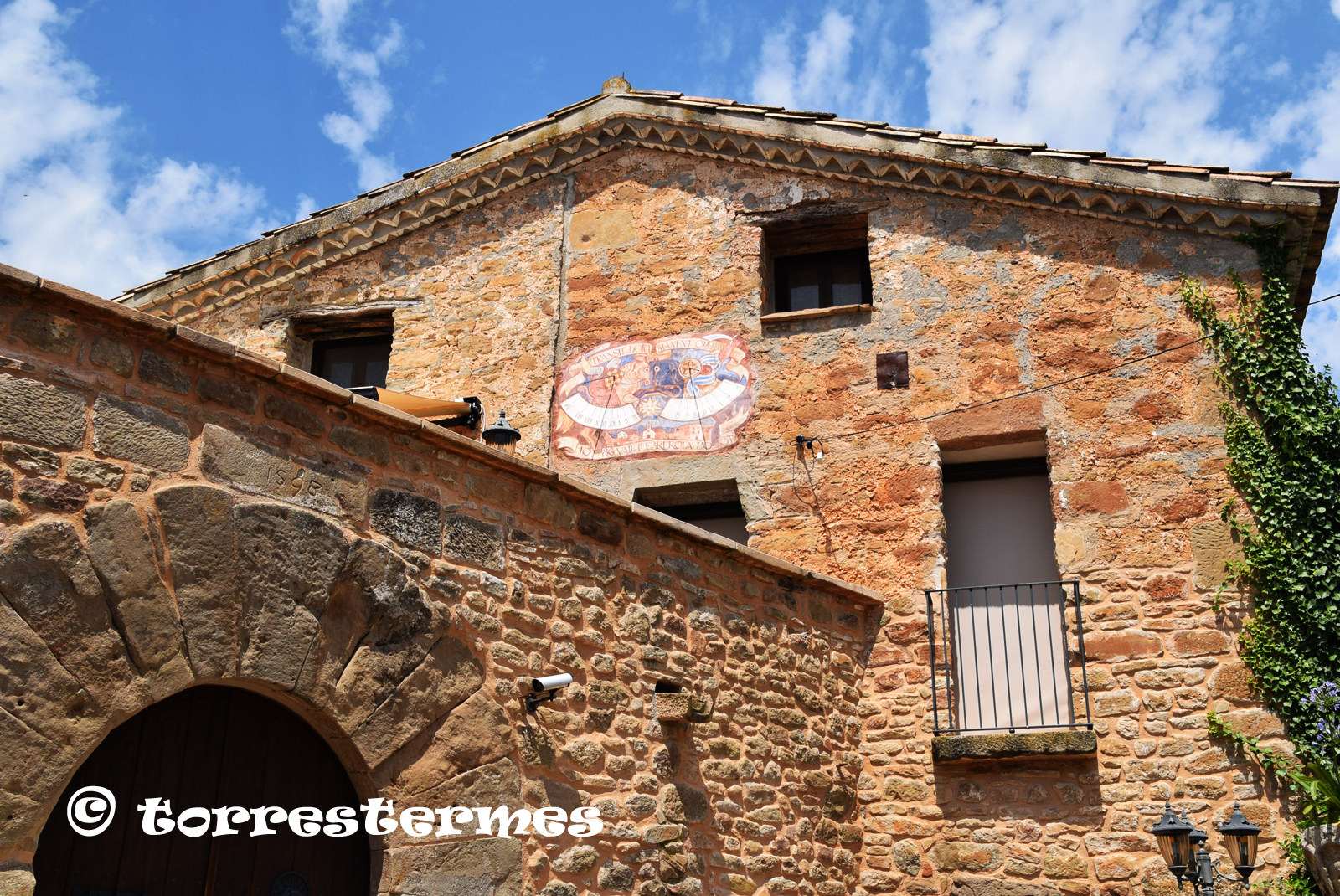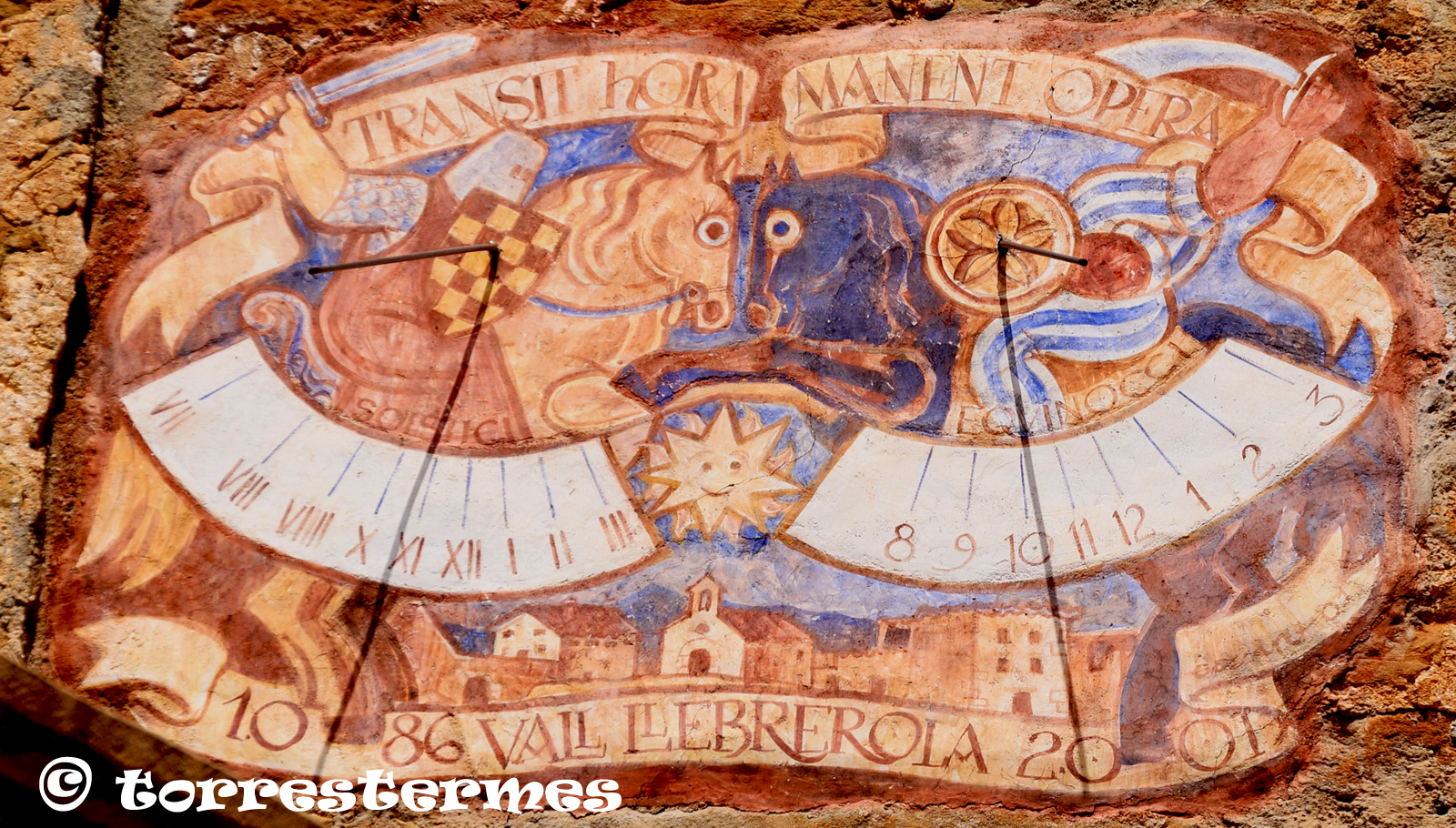 :: DESCRIPCIÓ: Doble rellotge vertical de matí, línies horàries, numeració en bandes, un quadrant en números romans (de VII a III) i l'altre en numeració aràbiga (de 8 a 3), gnòmons (20 cms.) varetes, lema, signat i datat il·legible, inscripcions, elevació 382 mts. snm.