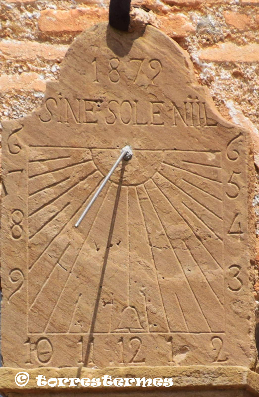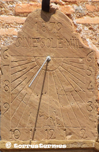 :: DESCRIPCIÓ: Vertical meridional, gravat en una placa de pedra, línies horàries i mitges hores més curtes, numeració aràbiga (de 6 a 6), gnòmon (20 cms.) vareta, lema, datat, elevació 336 mts. snm.