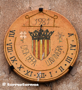 :: DESCRIPCIÓ: Vertical circular de matí, de fang cuit, sense línies, punts a les mitges hores, números romans (de VII a V) en corona, gnòmon (20 cms) vareta, datat, elevació 718 mts. snm.