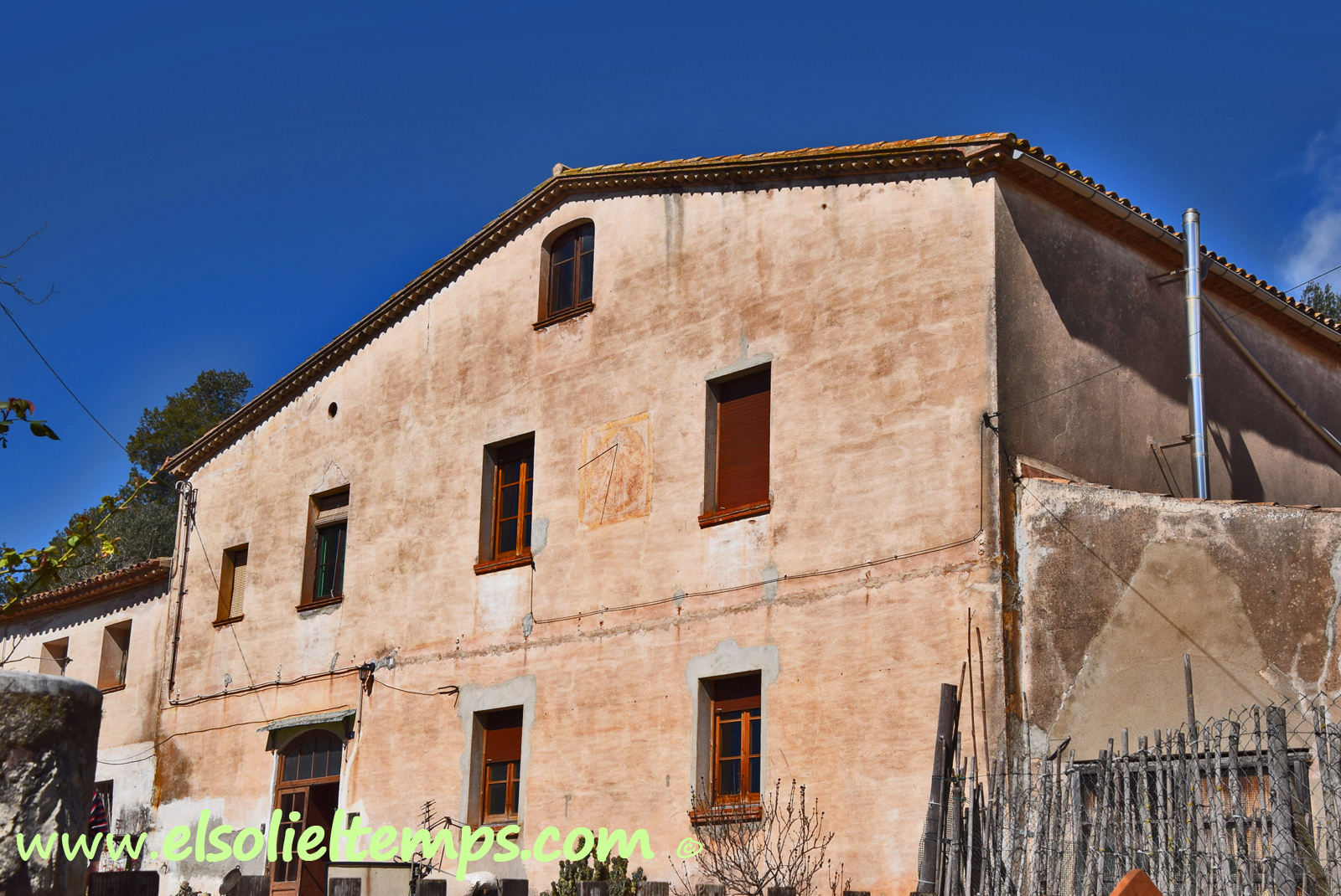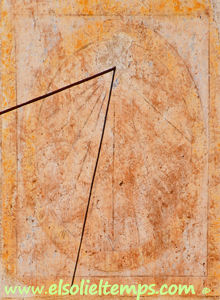 :: DESCRIPCIÓ: Vertical rectangular, de mati, força despintat, s'endevinen línies horàries i numeració aràbiga, gnòmon (80 cms.) vareta, elevació 389 mts. snm.