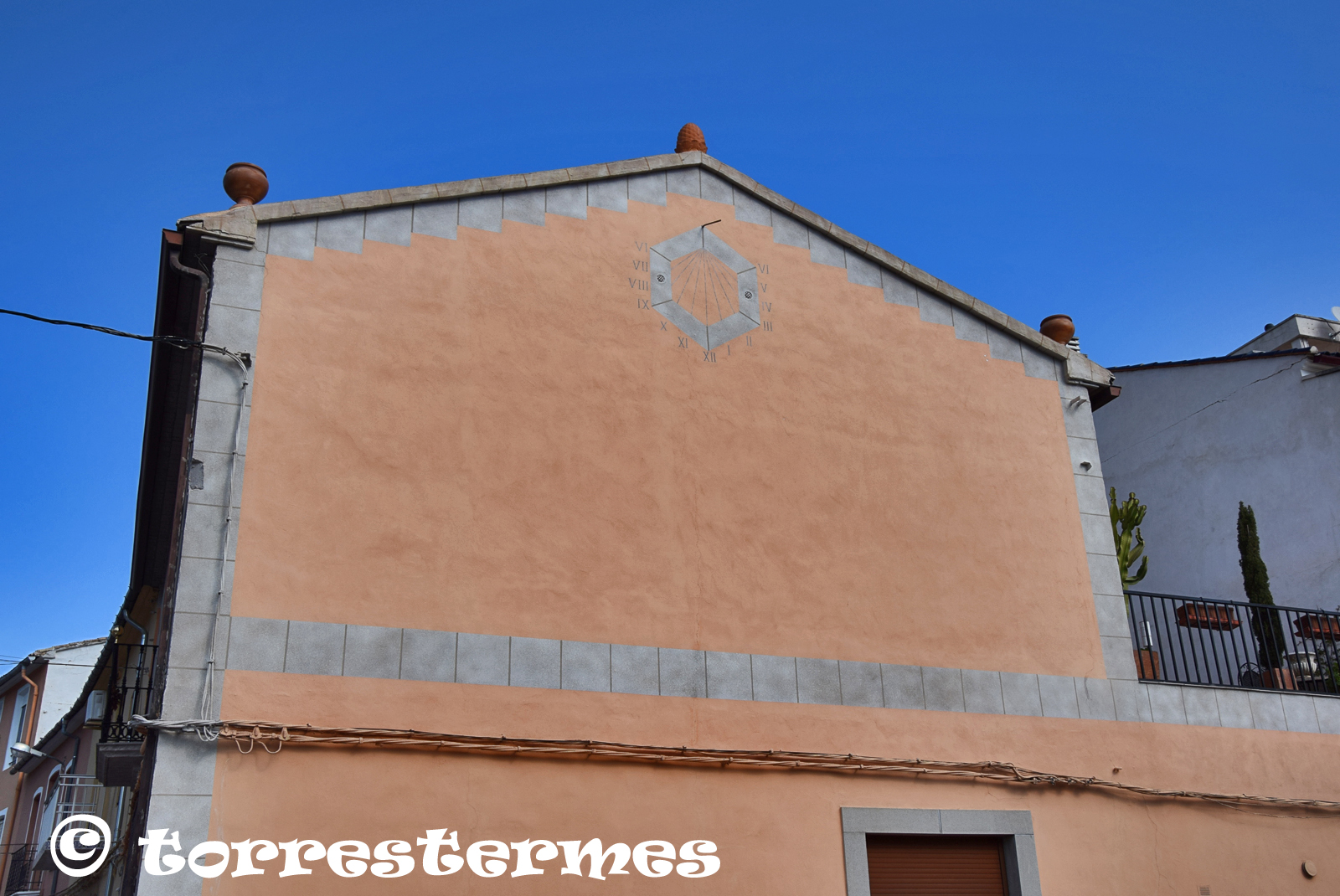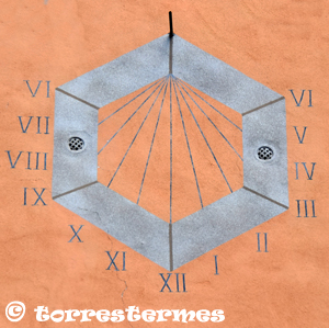 :: DESCRIPCIÓ: Vertical de matí, hexagonal, línies horàries, números romans (de VI a VI), gnòmon (30 cms) vareta, elevació 325 mts. snm.