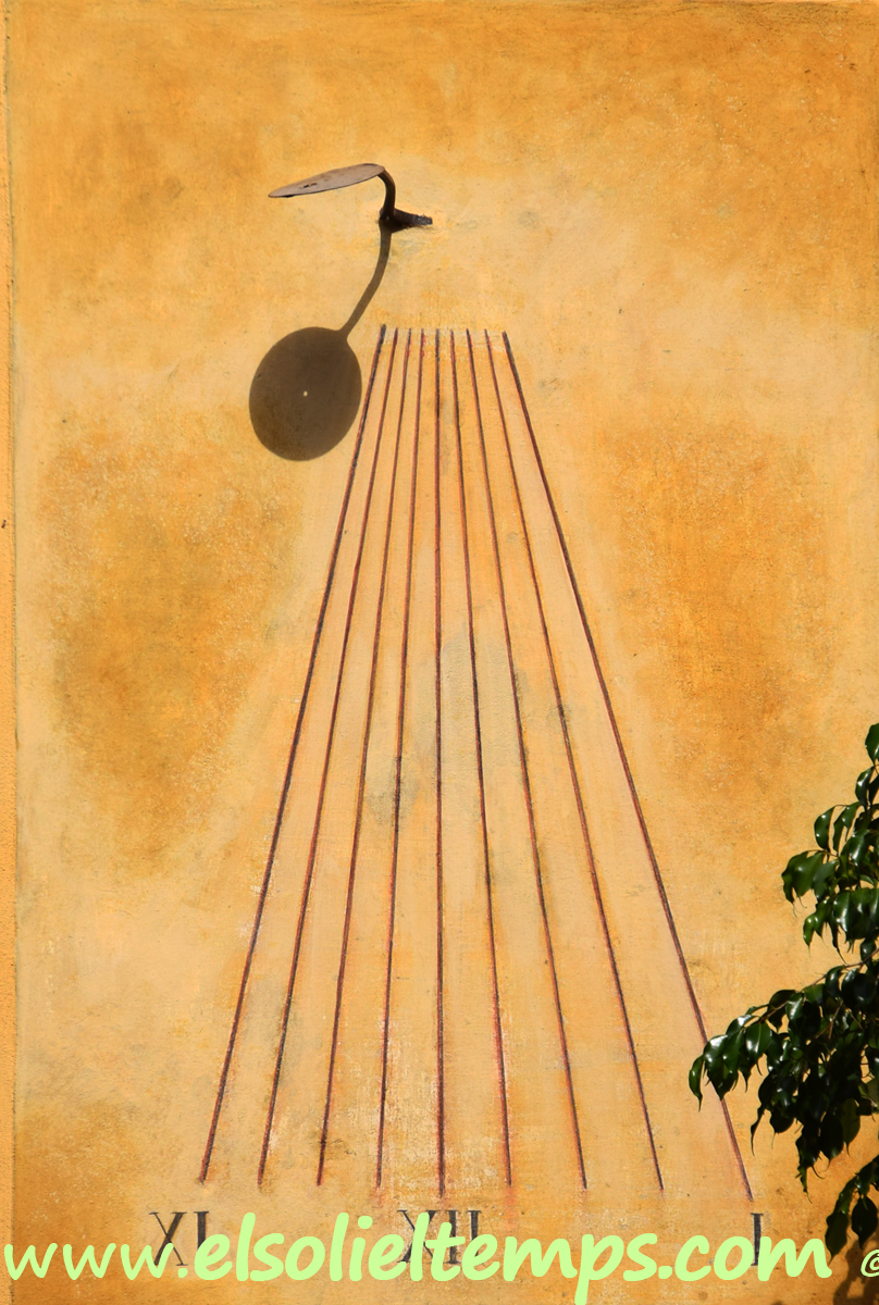 :: DESCRIPCIÓ: Meridiana vertical, línies horàries, mitges hores i quarts, números romans (XI, XII, I), gnòmon (10 cms.) horitzontal acabat en disc foradat, elevació 73 mts. snm.