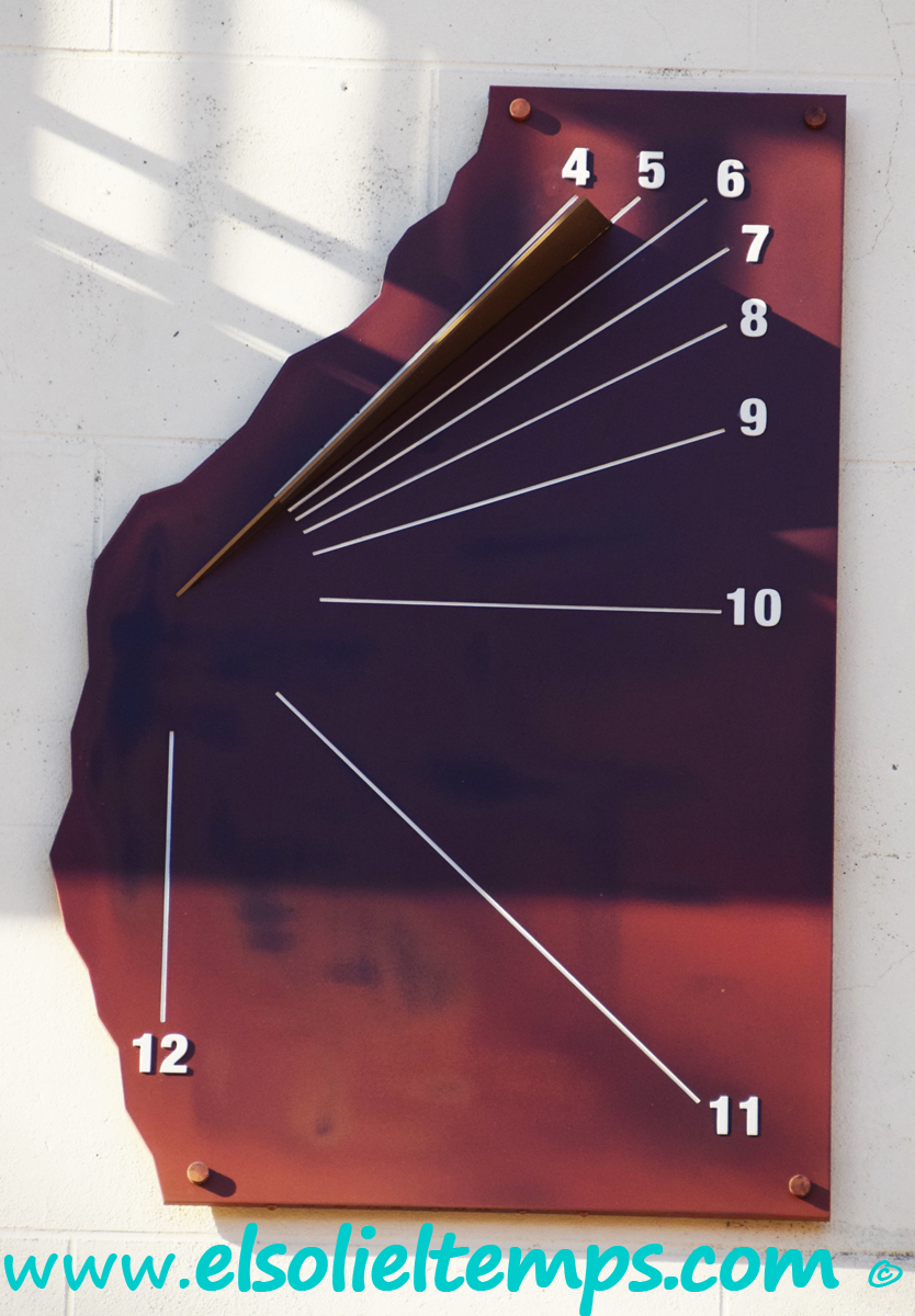 :: DESCRIPCIÓ: Molt declinant a llevant, forma amb perfil dels Països Catalans, línies horàries, numeració aràbiga (de 4 a 12), gnòmon (10 cms.) placa rectangular, elevació 796 mts. snm.