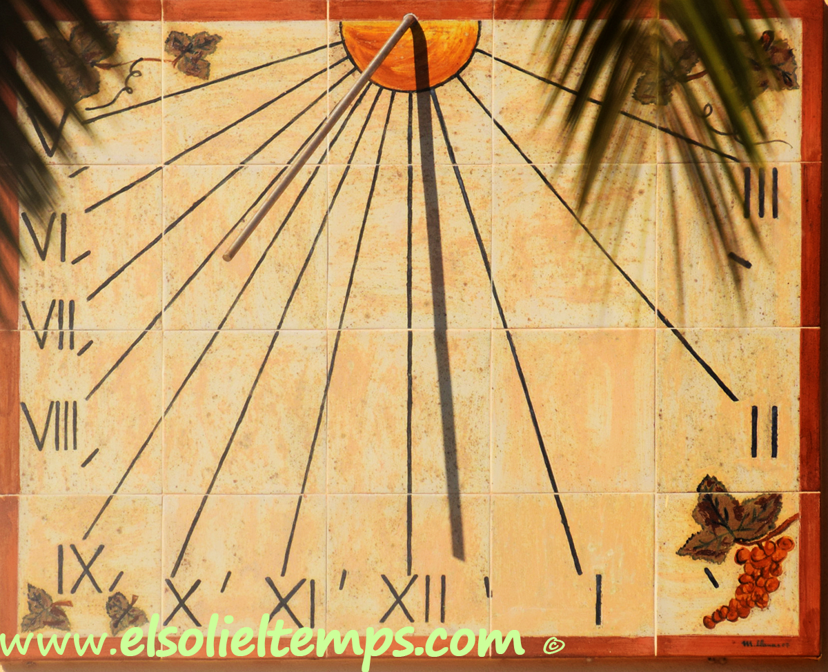 :: DESCRIPCIÓ: Composició de rajoles de ceràmica (5x4) vertical, orientat a llevant, línies horàries i marques a les mitges hores, números romans (de V a IV), gnòmon (40 cms.) vareta, datat, elevació 206 mts. snm.