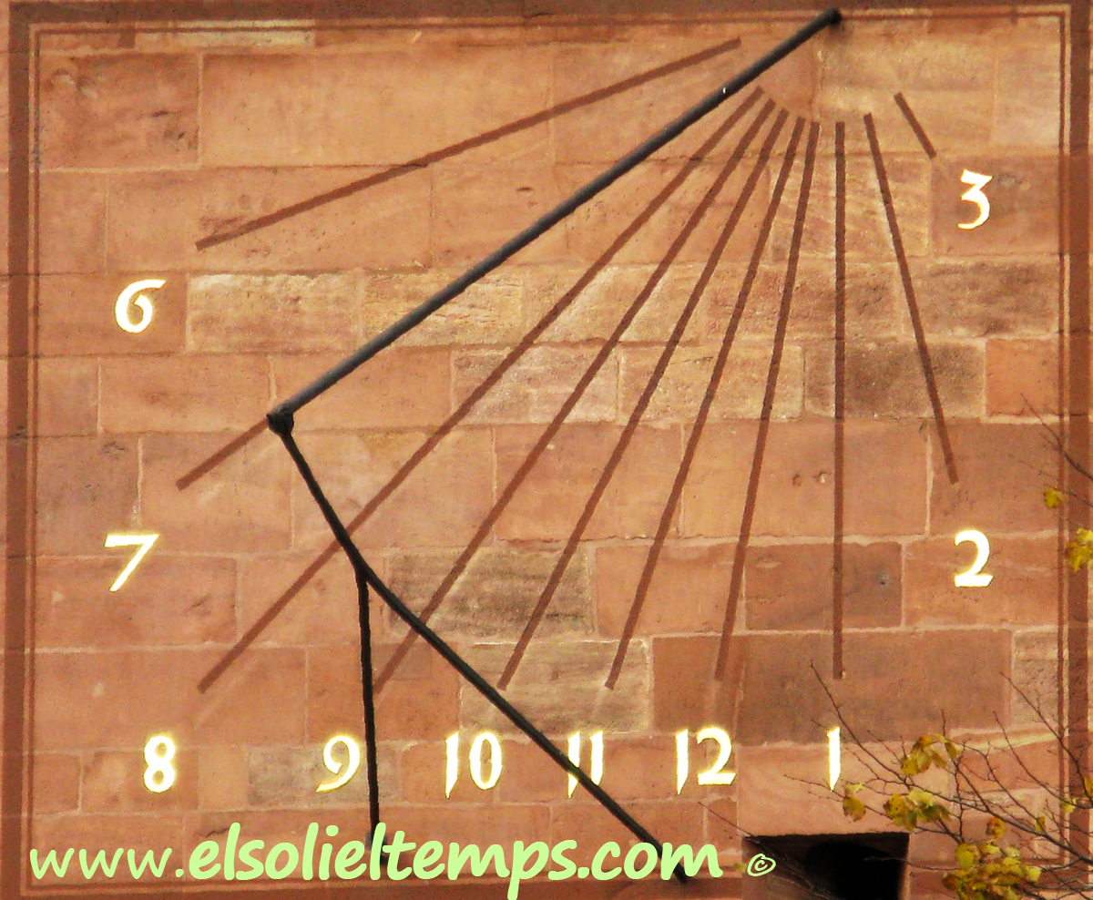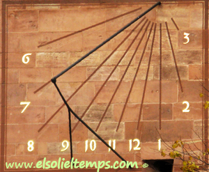 :: DESCRIPCIÓ: Rectangular vertical, orientat a llevant, línies horàries, numeració aràbiga (de 6 a 3), gnòmon (50 cms.) recolzat amb trípode, elevació 279 mts. snm.