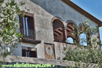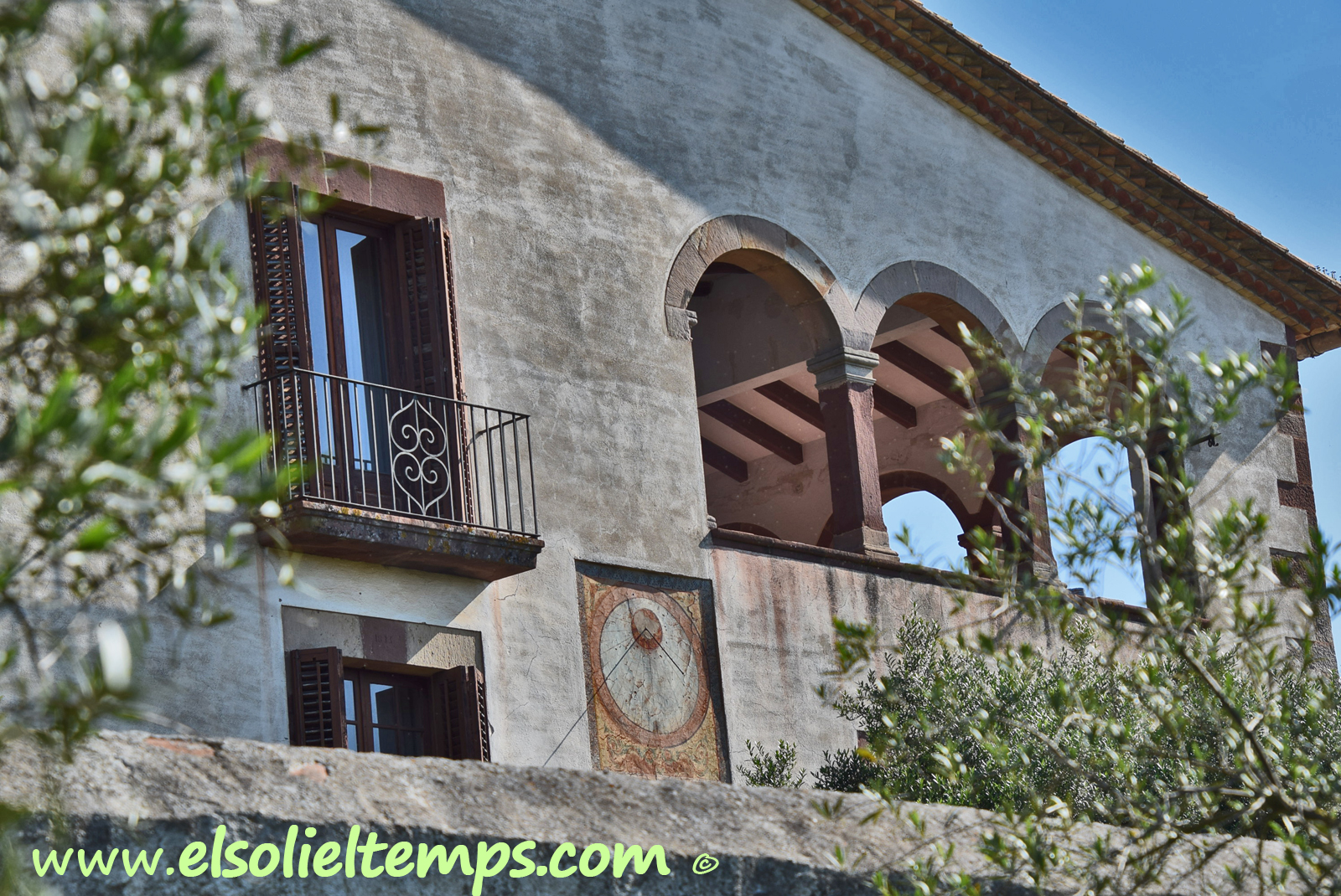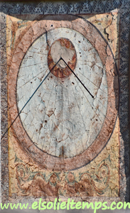 :: DESCRIPCIÓ: Vertical circular, dins de rectangle, línies horàries i mitges hores curtes, sense numeració aparent, gnòmon (50 cms.) acabat en boleta, elevació 430 mts. snm.