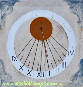 :: DESCRIPCIÓ: Vertical circular quasi meridional, línies horàries i mitges hores curtes, números romans (de IX a IV) en corona, gnòmon (40 cms.) vareta, elevació 375 mts. snm.