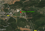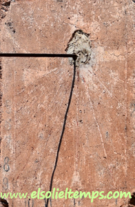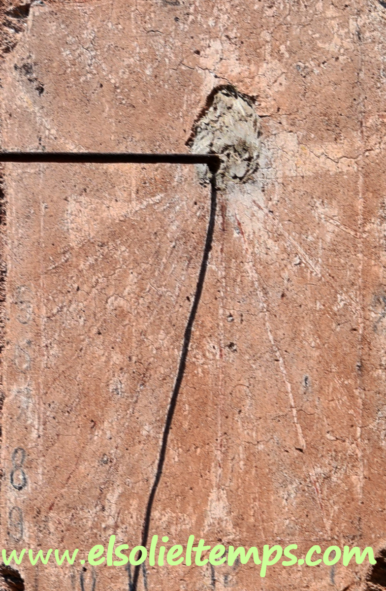 :: DESCRIPCIÓ: Vertical de matí, molt malmès, s'endevinen restes de línies horàries i numeració aràbiga, gnòmon (60 cms.) vareta, molt difícil de veure per un arbre que te al davant, elevació 401 mts. snm.