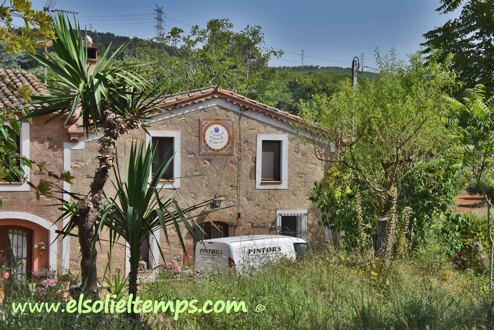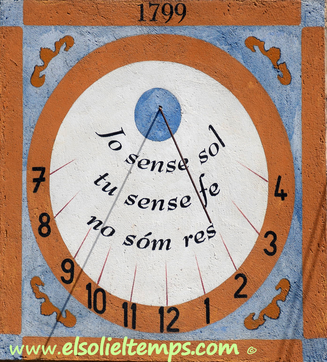 :: DESCRIPCIÓ: Vertical circular quasi meridional, línies horàries, numeració aràbiga (de 7 a 4) en corona, gnòmon (40 cms.) vareta, datat, lema, elevació 387 mts. snm.