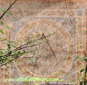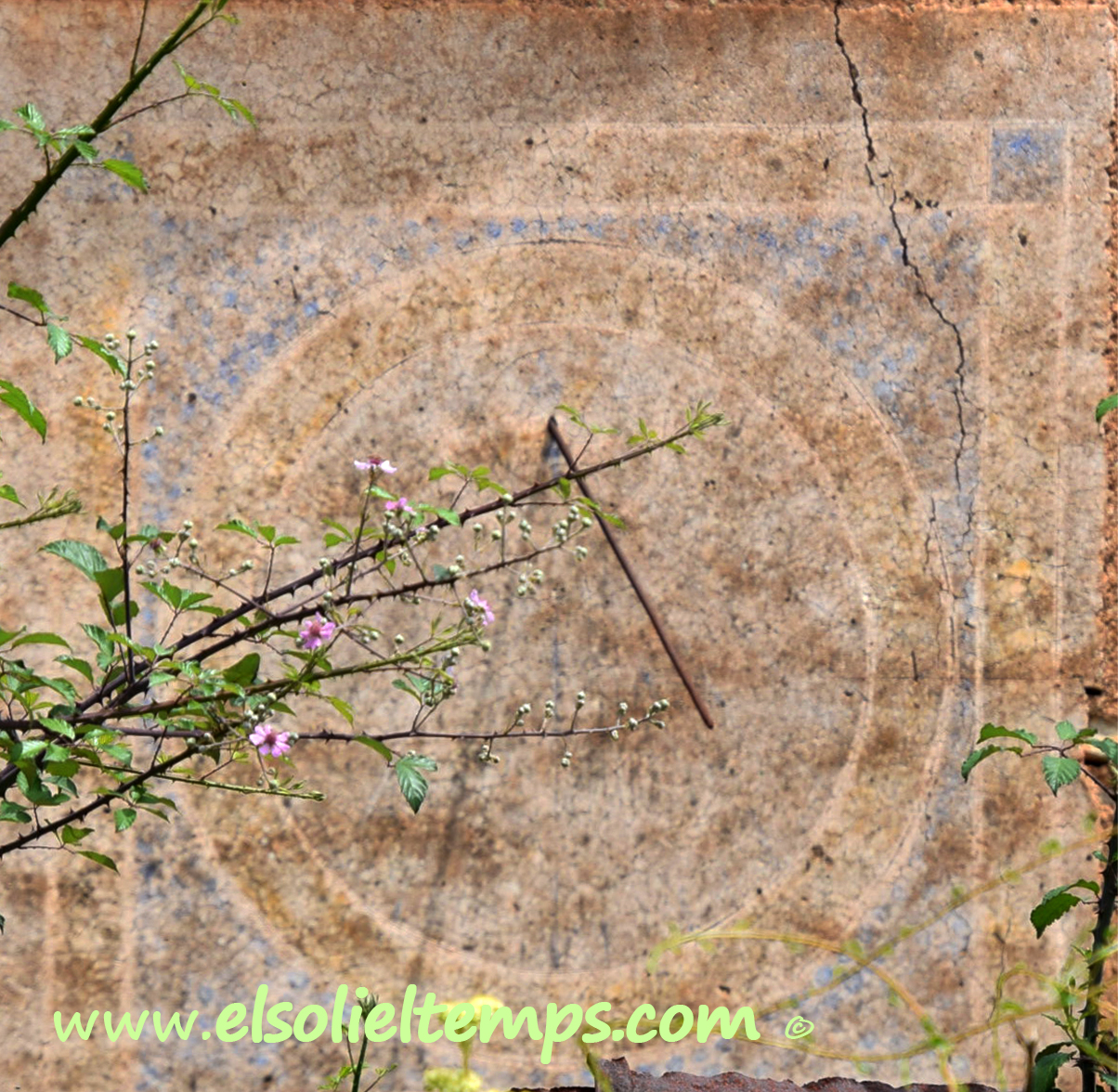 :: DESCRIPCIÓ: Vertical orientat a ponent, força malmès, es conserven restes de la policromia original, però no destaquen línies horàries ni numeració, gnòmon (50 cms.) vareta, elevació 359 mts. snm. No ha estat mai restaurat.