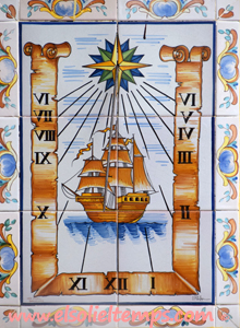 :: DESCRIPCIÓ: Composició vertical de rajoles de ceràmica (2x3), de sèrie, línies horàries, números romans (de VI a VI), gnòmon (20 cms.) vareta, calculat meridional en paret que declina a llevant, elevació 363 mts. snm.