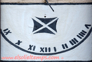 :: DESCRIPCIÓ: Vertical rectangular, orientat a ponent, entre dues finestres, tapat parcialment pels porticons, sense línies, números romans (de IX a V), gnòmon (10 cms.) vareta, elevació 907 mts. snm.