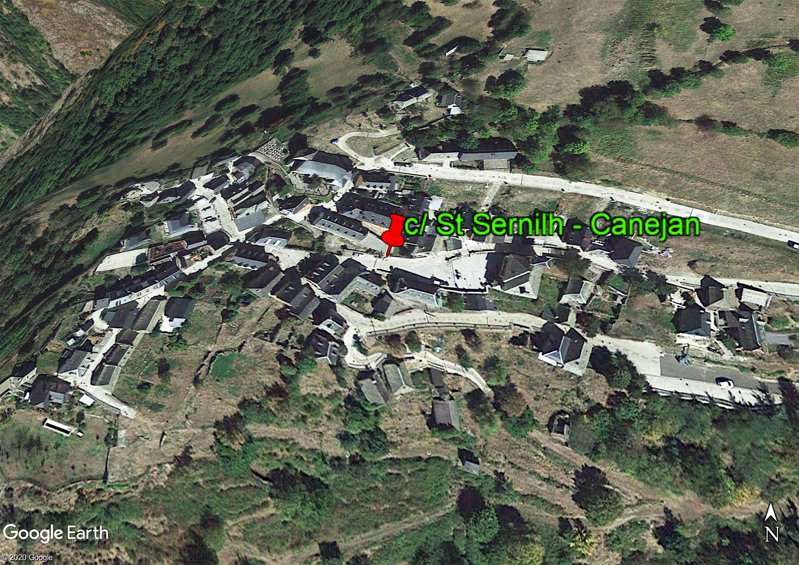 :: NOTES: El poble de Canejan (Terçon de Quate Lòcs), fronterer amb França, està situat a 906 m d'altitud, enlairat sobre la riba dreta del riu de Toran, molt a prop de la seva confluència amb la Garona.