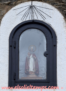 :: DESCRIPCIÓ: Senzill rellotge, rural i eclèctic, vertical de tarda, en el marc d'una capella dedicada a Sant Blai, línies horàries, sense numeració, gnòmon (10 cms.) vareta, elevació 1034 mts. snm.