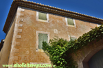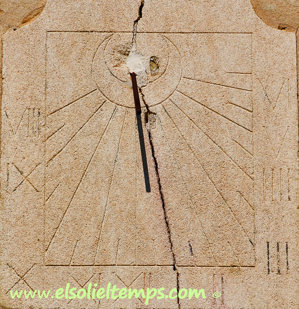 :: DESCRIPCIÓ: Vertical de tarda, gravat a la pedra, línies horàries i mitges hores més curtes, números romans (de VIII a VI) en marc, gnòmon (10 cms.) vareta, una mica malmès, elevació 158 mts. snm.