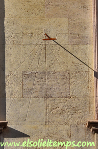 :: DESCRIPCIÓ: Vertical meridional, gravat a la pedra de la façana, línies horàries i mitges hores, sense numeració visible, gnòmon (30 cms.) acabat en disc foradat, elevació 33 mts. snm.