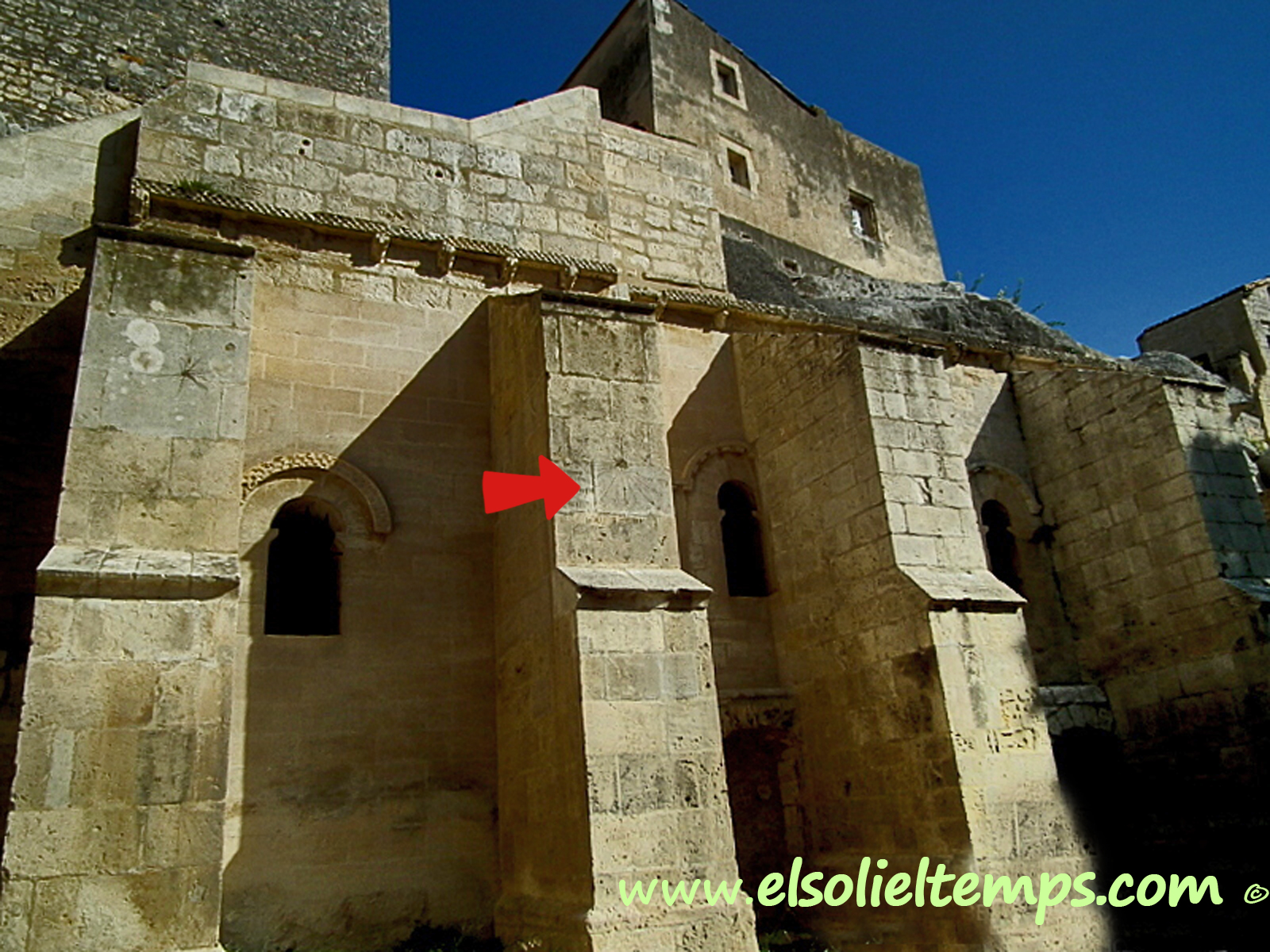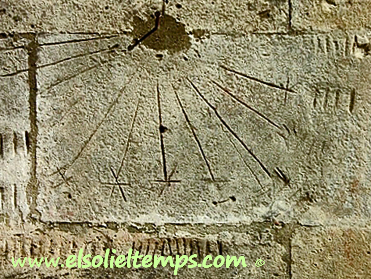 :: DESCRIPCIÓ: Vertical rectangular de matí, d'estil rudimentari, gravat a la pedra del contrafort, línies horàries, sense numeració visible, gnòmon (10 cms) no sembla l'adequat, elevació 13 mts. snm.
