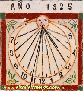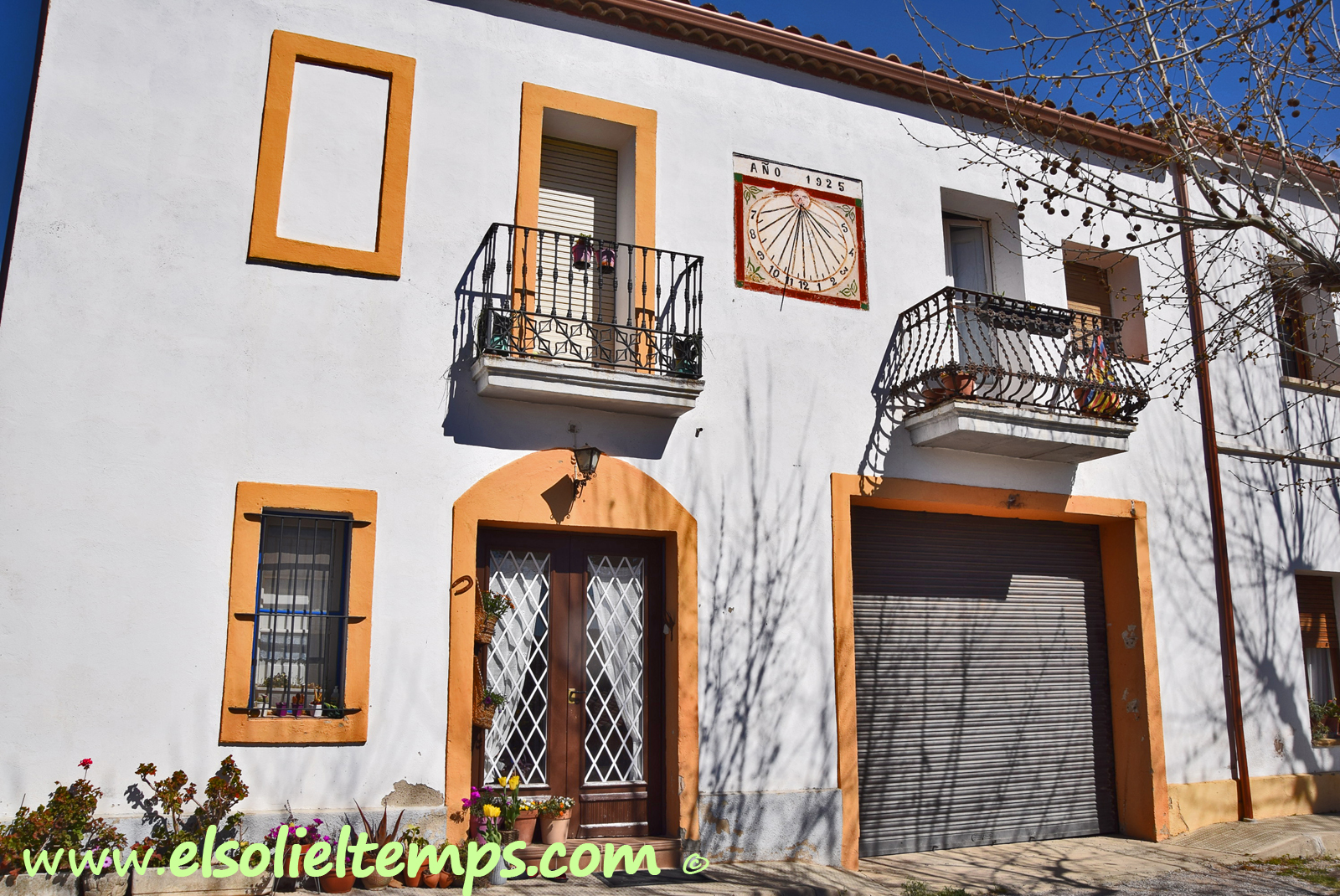 :: DESCRIPCIÓ: Vertical meridional circular dins un quadrat, línies horàries i mitges hores molt curtes, numeració aràbiga (de 7 a 5) en corona, datat, gnòmon (30 cms.) vareta, elevació 376 mts. snm.