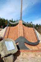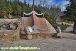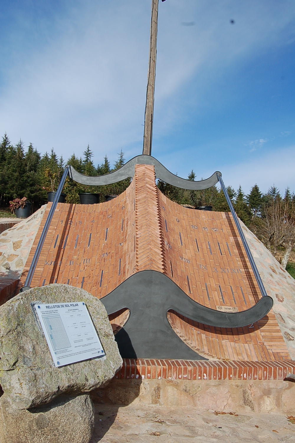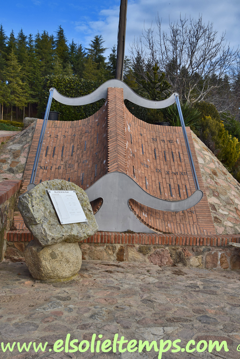 :: DESCRIPCIÓ: De gran tamany, en forma de llibre, línies horàries, tres horaris: d’hivern (números àrabs de 1 a 1), local (temps vertader) (romans de XII a XII) i d’estiu (àrabs de 2 a 2), gnòmon (2 mts.) paral·lel, lema, signat i datat, elevació 1004 mts. snm.