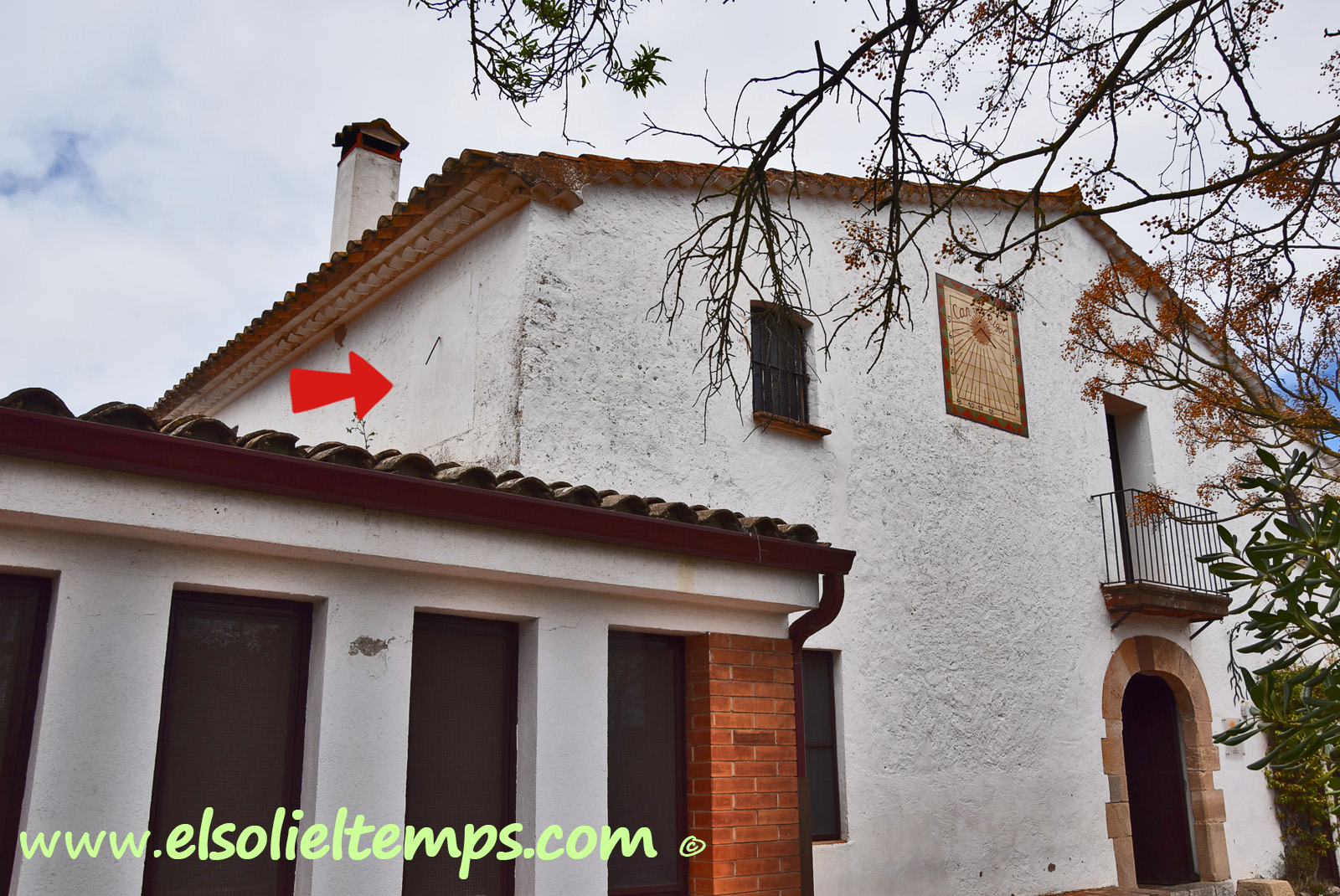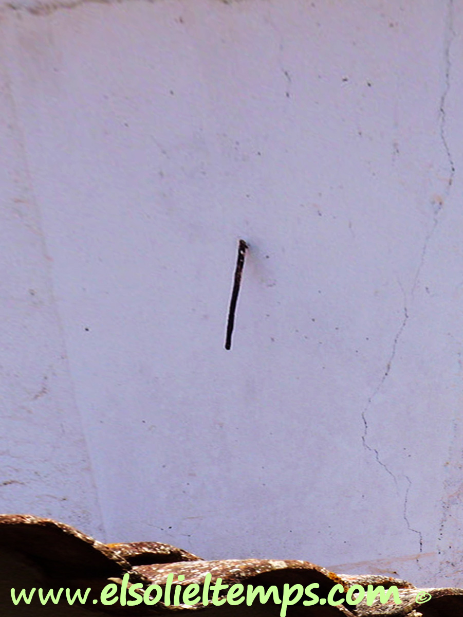 :: DESCRIPCIÓ: Restes d'un rellotge vertical de tarda, sense decoració, sols resta el gnòmon (40 cms.) vareta, elevació 380 mts. snm.