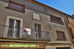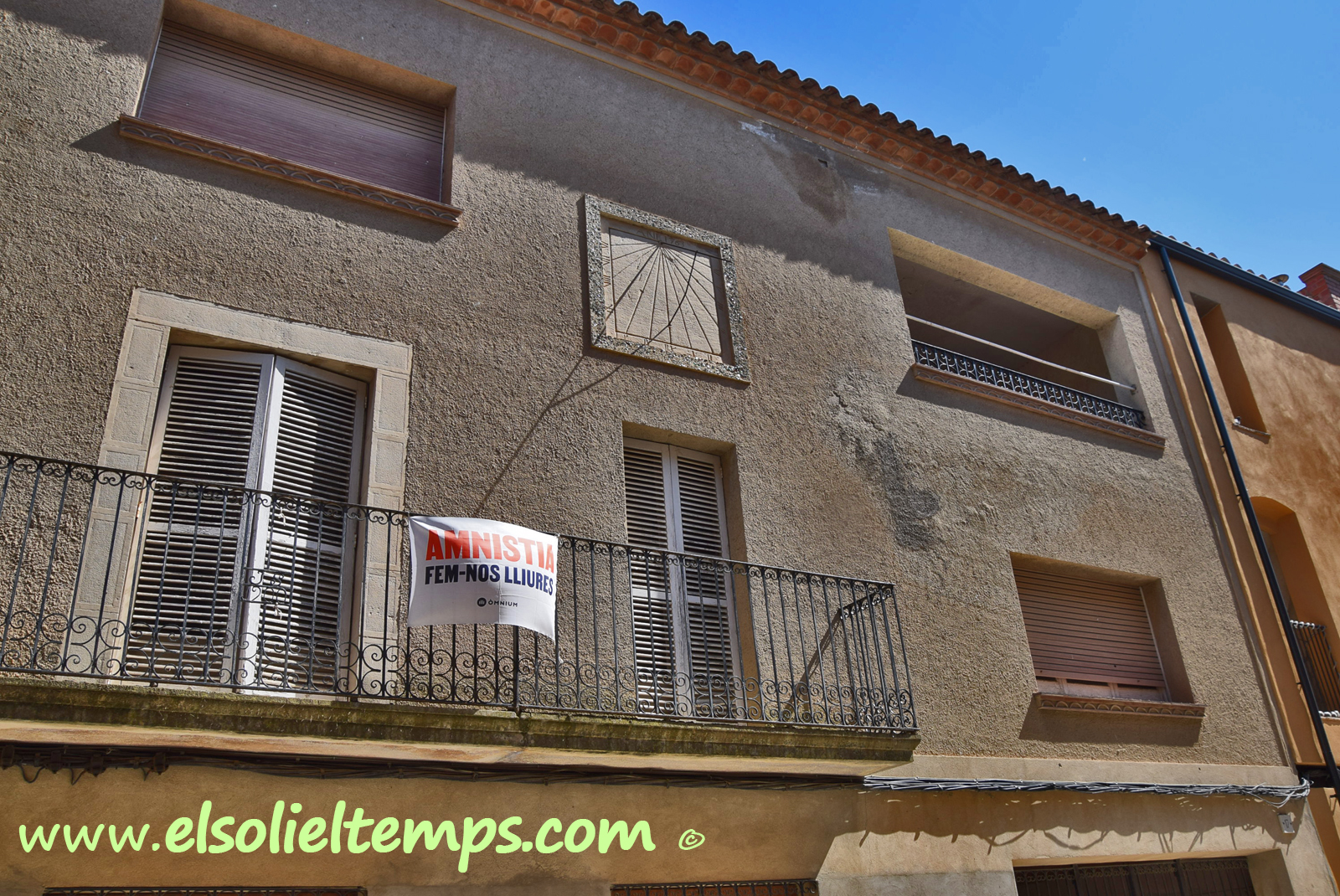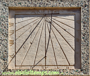 :: DESCRIPCIÓ: Vertical rectangular de tarda, gravat en una llosa de pedra, línies horàries, números romans (de VI a IV) en marc, gnòmon (80 cms.) recolzat, datat, elevació 215 mts. snm.
