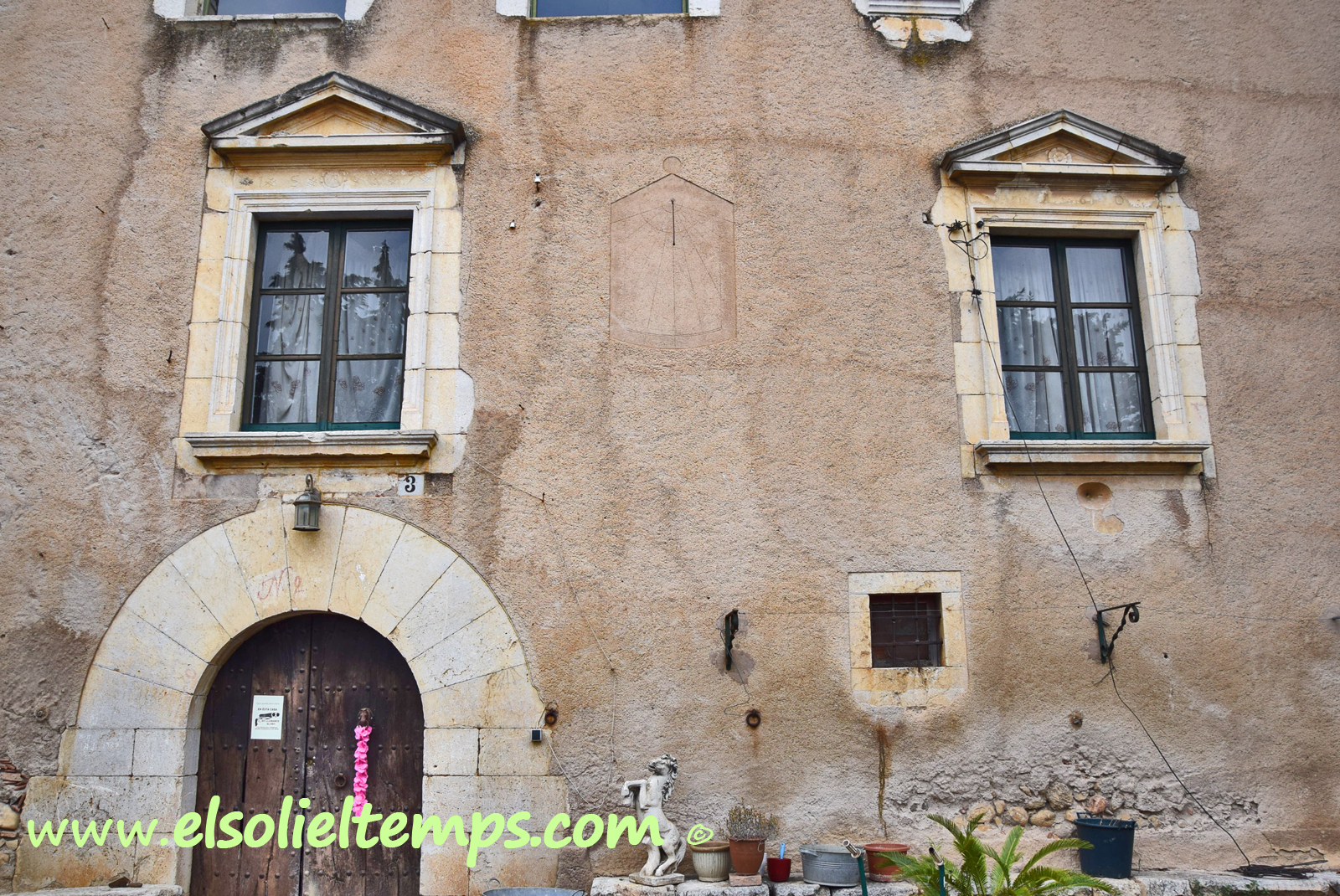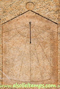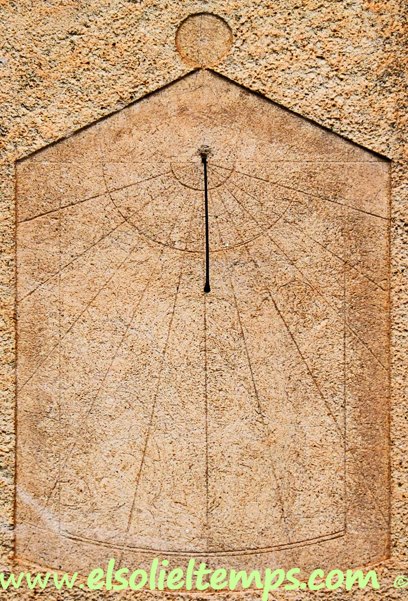 :: DESCRIPCIÓ: Vertical meridional, línies horàries, sense numeració, gnòmon (60 cms.) vareta acabat en boleta, elevació 80 mts. snm.