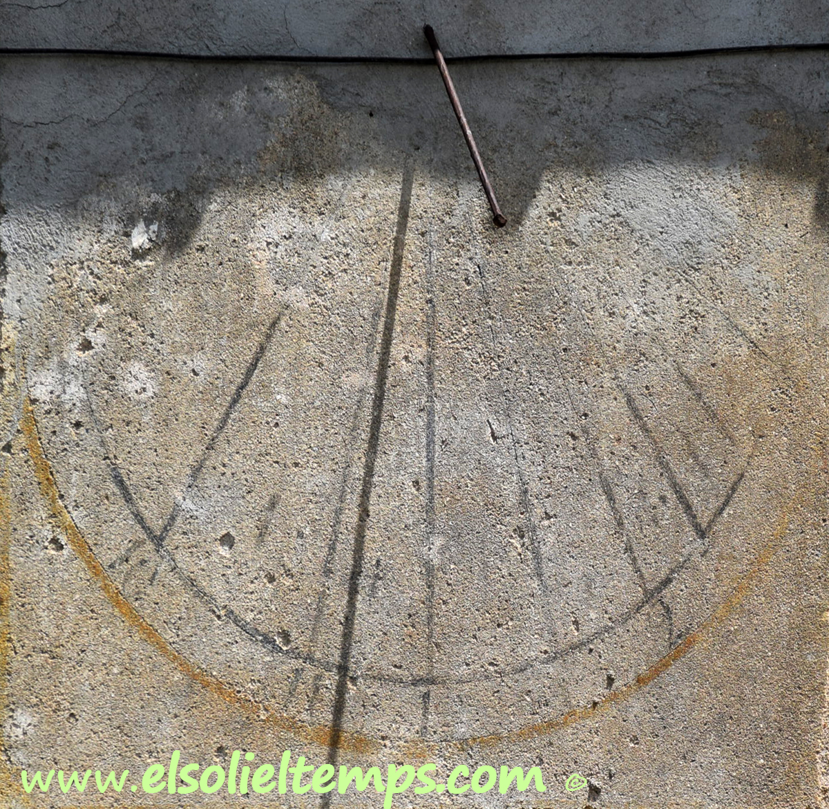 :: DESCRIPCIÓ: Vertical de tarda, semicircular, força esborrat, s'endevinen línies horàries, mitges hores més curtes i números romans, gnòmon (40 cms.) acabat en boleta, elevació 116 mts. snm.