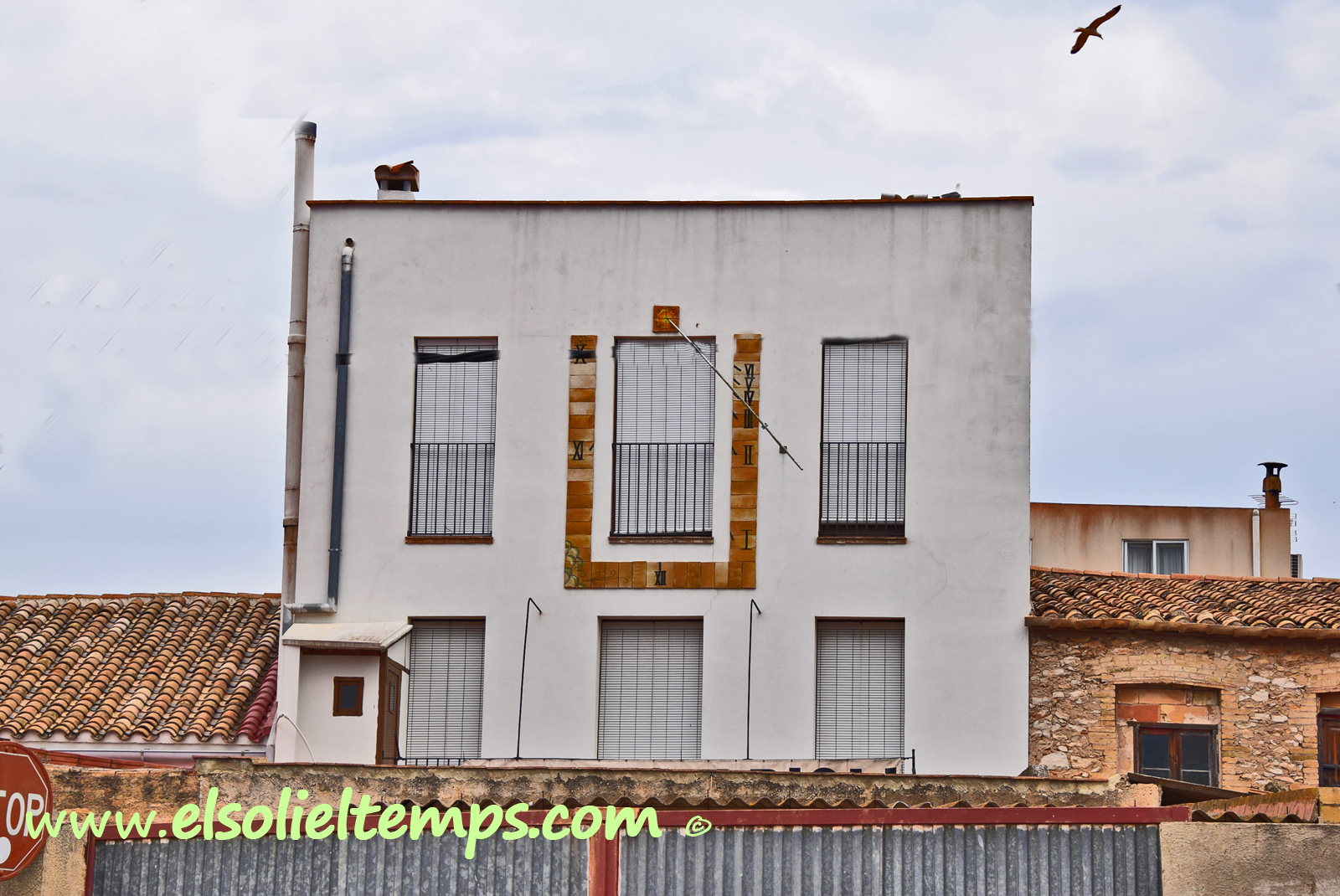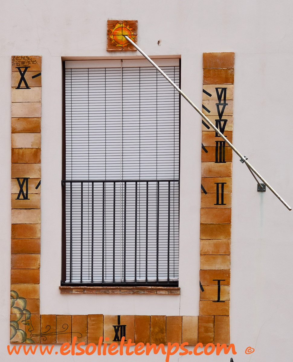 :: DESCRIPCIÓ: Fet amb rajoles de ceràmica al voltant d'un balco, façana posterior de l'edifici (es veu des del carrer del Pont), línies curtes, números romans (de X a VI), gnòmon (150 cms.) un suport, elevació 21 mts. snm.