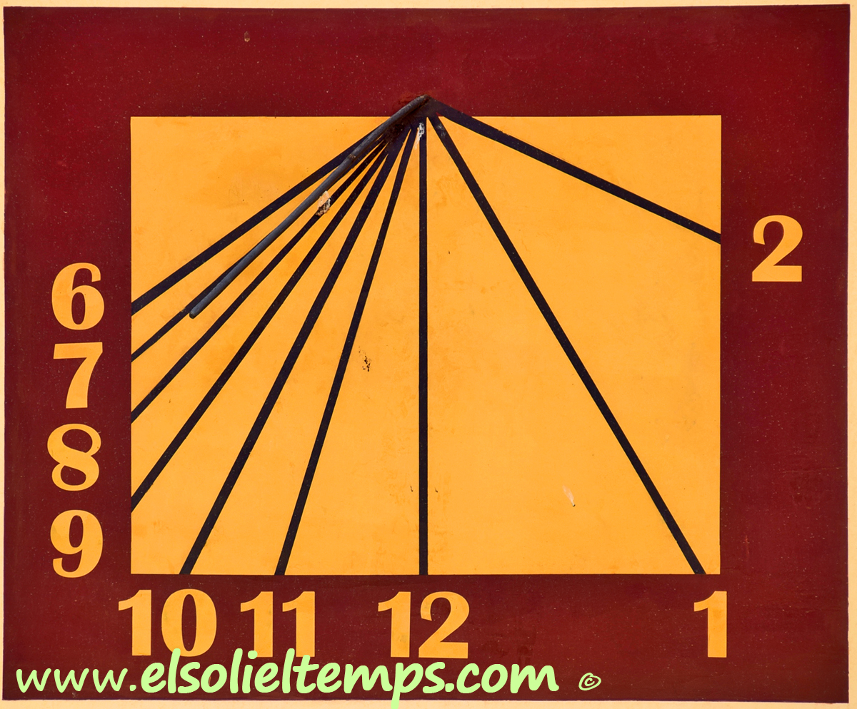 :: DESCRIPCIÓ: Vertical rectangular, de matí, línies horàries, numeració aràbiga (de 6 a 2) en marc, gnòmon (40 cms.) vareta, elevació 12 mts. snm.