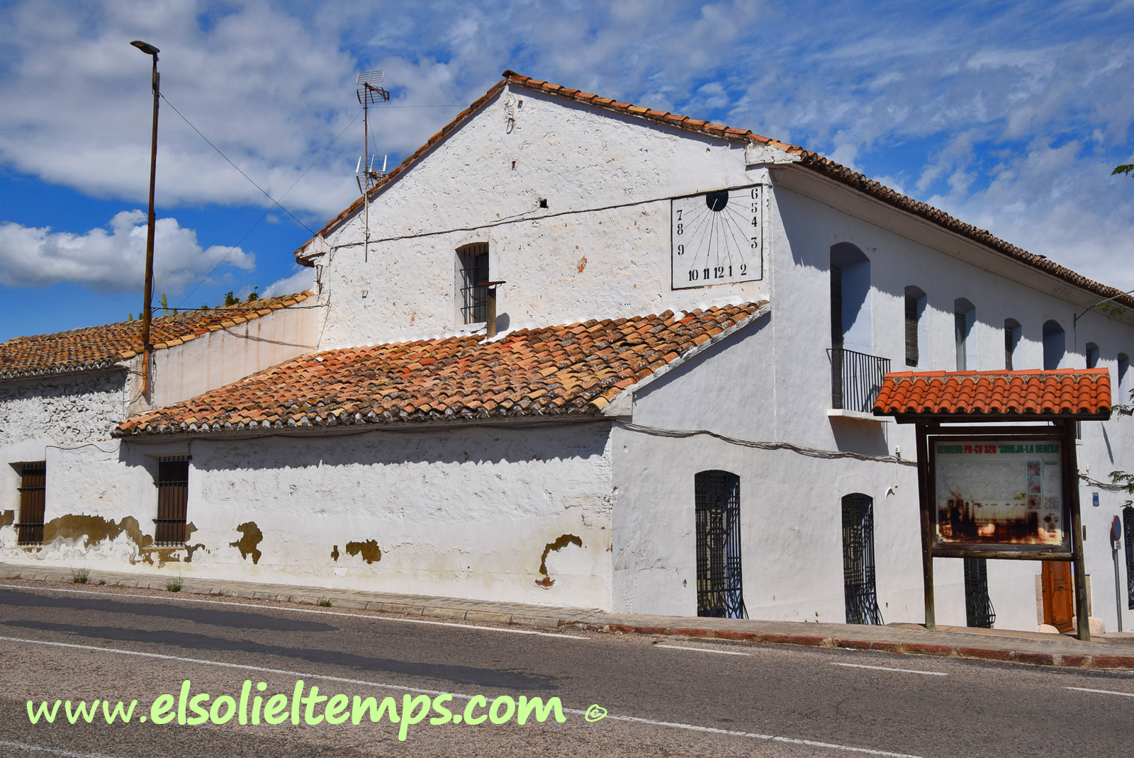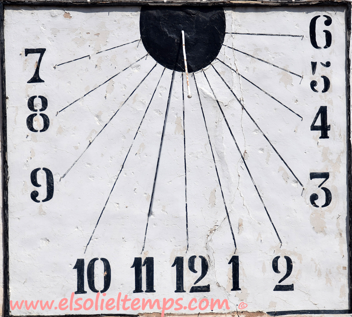 :: DESCRIPCIÓ: Vertical rectangular de tarda, línies horàries, numeració aràbiga (de 7 a 6) gnòmon (30 cms.) vareta, elevació 283 mts. snm.