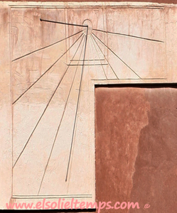 :: DESCRIPCIÓ: Vertical força declinant de tarda, de forma irregular, sembla inacabat, línies horàries i algunes mitges hores, sense numeració evident, gnòmon (50 cms.) acabat en boleta, elevació 1156 mts. snm.